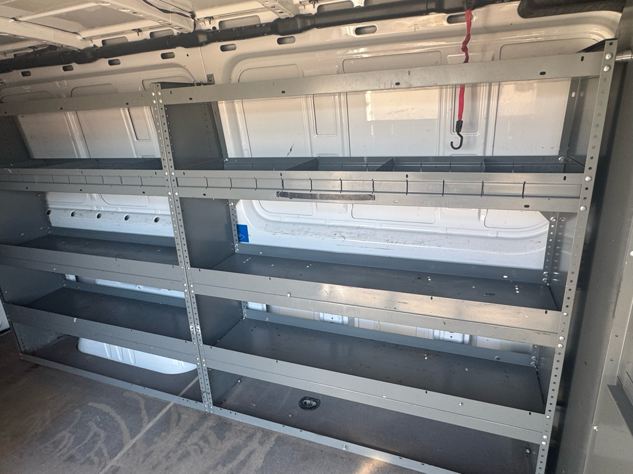 Outfitted with professional shelving and a Prime Design ladder rack, this van is fully equipped for contractors, electricians, HVAC technicians, and service professionals who need efficient storage and easy equipment access.
